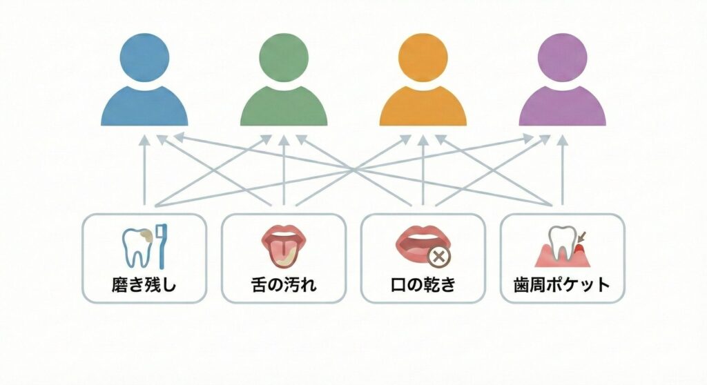 磨き残しが気になる人もいれば、舌の汚れや歯周環境、口の乾きが影響している場合もあります。