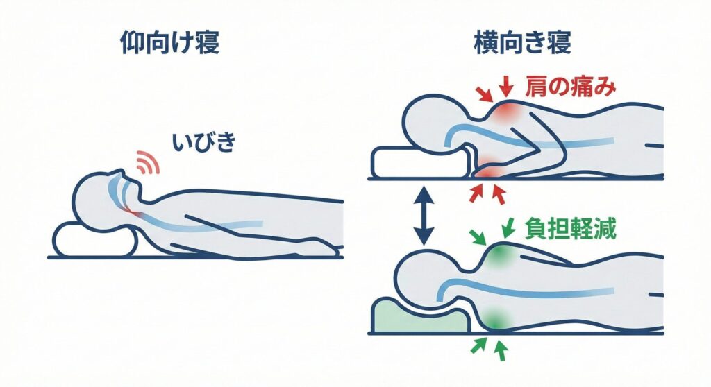 横向き寝にすることで気道は確保されますが、通常の枕では肩や首に負担がかかり、今度は痛みという新たな問題が生じます。